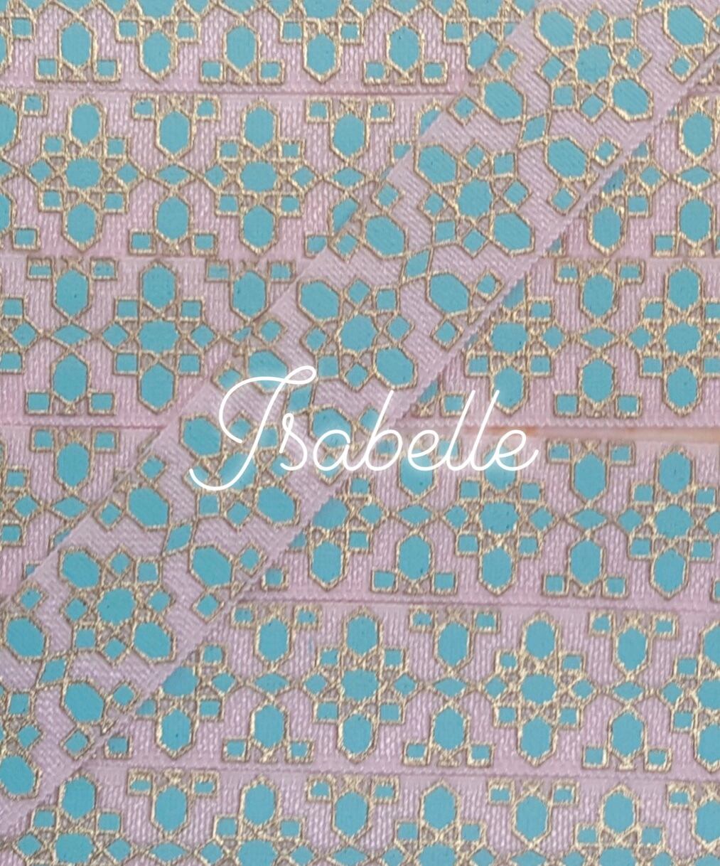 パステルピンク色に水色とゴールドが入ったデザイン。オリエンタルなイメージの柄です。
